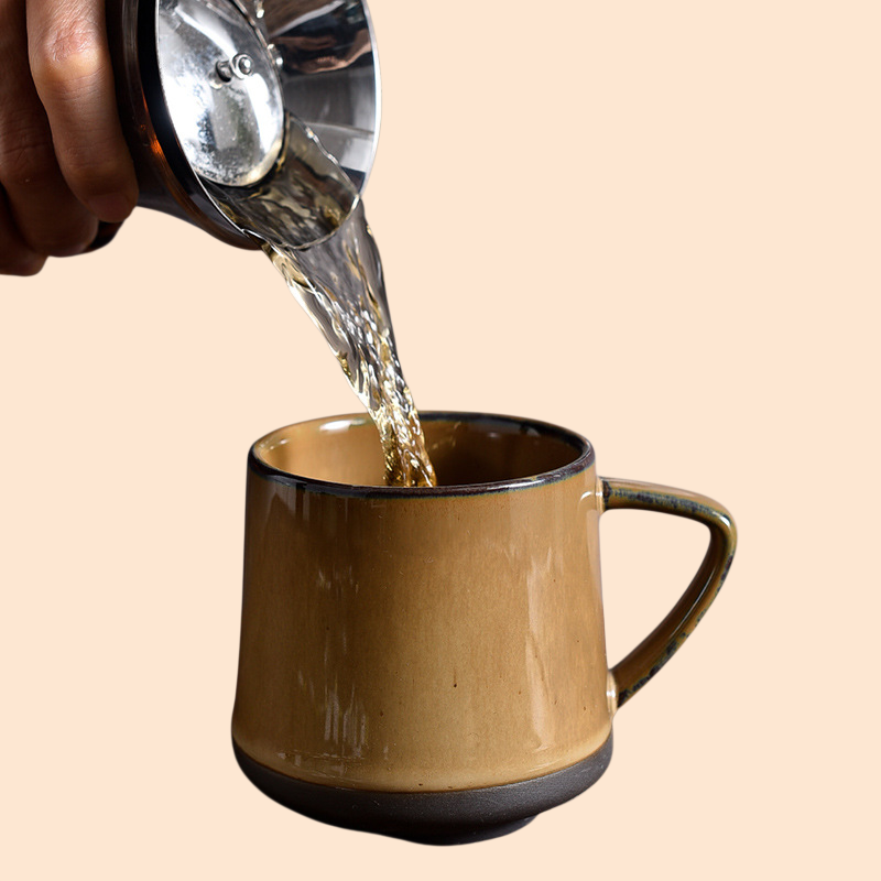 Retro ceramic cup features durable ceramic material, vintage design, easy-to-clean surface, and comfortable grip, suitable for home or office use.